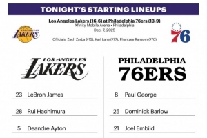 NBA直播12月8日讯 今日8点半,76人主场对阵湖人。赛前双方公布了本场首发阵容:
