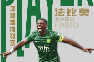 NBA直播12月8日讯 2场比赛攻入6球的国安外援法比奥,当选为中超11月最佳球员。