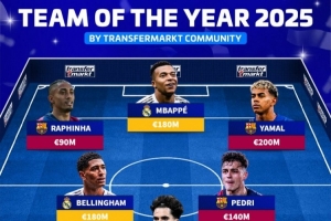 NBA直播12月8日讯 德转列出经投票选出的2025年度最佳阵,姆巴佩、亚马尔、贝林厄姆、佩德里在列。