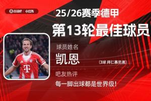 第13轮评选结果结出炉,凯恩替补登场30分钟上演帽子戏法,助拜仁大胜斯图加特,获得吧友超2.7万票支持,当选【NBA直播X小红书德甲第13轮最佳球员】!