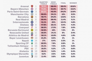 NBA直播12月9日讯 本赛季欧冠联赛阶段第6轮的比赛即将开打,opta在当地时间12月9日对本赛季欧冠的形势进行了新一轮预测,阿森纳夺冠概率22.6%最高,拜仁、巴黎排在二三位。