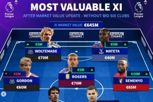 NBA直播12月10日讯 德转于12月9日更新了英超球员身价,列出了无Big6球员的身价最贵阵,托纳利、格伊、摩根·罗杰斯在列,总身价6.45亿欧。