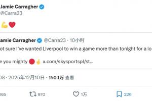NBA直播12月10日讯 利物浦1-0客胜国米,卡拉格转发了赛前谈萨拉赫的推文,并配文:拿下!
