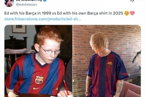 NBA直播10月24日讯 英国创作歌手艾德-希兰更新社媒,晒出自己在1999年和2025年身穿巴萨球衣的照片。