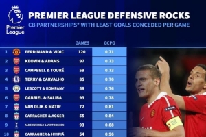NBA直播10月24日讯 《转会市场网》统计了英超历史场均丢球数最少的20组中后卫搭档,该榜单只统计合作了50场以上的中后卫搭档。