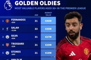 NBA直播12月10日讯 德国转会市场统计了英超30岁以上球员身价排名,曼联队长布鲁诺·费尔南德斯排名第一。