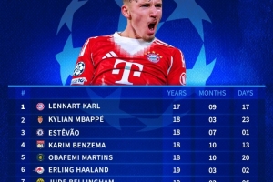 NBA直播12月10日讯 在本轮欧冠拜仁3-1击败葡体的比赛中,卡尔破门,也成为欧冠最年轻连续3场进球球员。以下为自92/93赛季欧冠改制以来最年轻连续3场破门纪录榜: