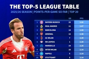 NBA直播10月25日讯 《转会市场》统计了本赛季五大联赛球队的场均拿分情况,拜仁、皇马、巴萨、阿森纳分列前四。