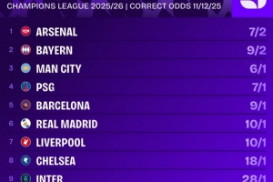 NBA直播12月11日讯 欧冠联赛阶段第6轮比赛战罢,相关机构列出了各队夺冠的赔率,阿森纳居首。