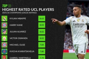 NBA直播12月11日讯 WhoScored统计了本赛季球员在欧冠比赛中的场均评分,并列出评分最高榜单,姆巴佩8.63分居首,凯恩8.03分次席。