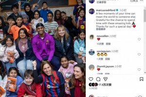 NBA直播12月12日讯 拉什福德参加巴萨基金会活动,与孩子们互动并合影。