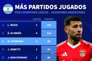 NBA直播12月12日讯 德国转会市场统计了阿根廷球员的欧冠出场次数,并列出榜单,梅西、迪马利亚前两名,奥塔门迪升至第三位。