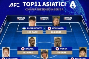 NBA直播12月13日讯 德转列意甲出场最多的亚洲球员11人阵容,中田英寿、长友佑都、奥代罗在列。