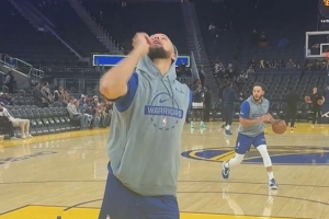 本场复出的库里进行了赛前热身,热身时,他上脚了阿迪达斯球鞋,爱德华兹一代。