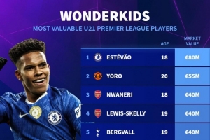 NBA直播12月13日讯 德国转会市场列出了英超U21球员身价排名,埃斯特旺8000万欧居首,约罗5500万欧次席。