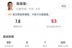 NBA直播12月14日讯 西甲第16轮,巴萨主场2-0击败奥萨苏纳,佩德里代表巴萨首发出战88分钟,球员本场数据如下: