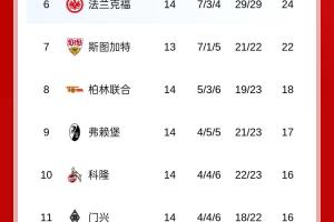 NBA直播12月15日讯 德甲第14轮基本结束,拜仁1-1美因茨9分领跑,此前第2的莱比锡本轮1-3不敌柏林联合,第3的多特1-1憾平弗赖堡,最新积分榜如下: