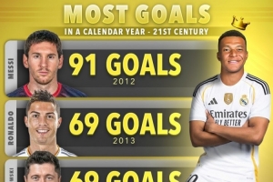 NBA直播12月15日讯 西甲第16轮比赛,姆巴佩破门,皇马客场2-1击败阿拉维斯。据Score90统计,姆巴佩2025年打进63球,排名本世纪自然年进球榜第四位。