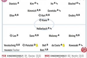NBA直播12月15日讯 德甲第14轮比赛,拜仁主场2-2战平美因茨,德国媒体《踢球者》对两队球员进行了评分,奥利塞、基米希、卡尔2.5分拜仁队内最高。
