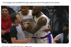 NBA直播12月16日讯 湖人昨日客场116-114险胜太阳,比赛中詹姆斯对裁判进行推搡和大喊大叫,但没有吃到技犯引起热议。