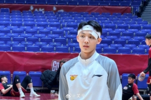 赛前,广东体育频道记者关辛发博晒照,广东后卫徐杰戴着发带在赛前进行热身。