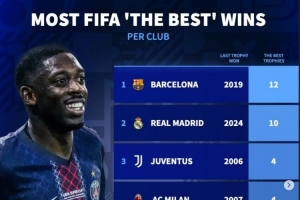 NBA直播12月17日讯 FIFA年度颁奖典礼结束,登贝莱获FIFA年度最佳球员,德转列各俱乐部球员获FIFA年度最佳球员次数,巴萨12次居首,皇马10次第二,尤文、米兰、国米、巴黎4次并列第三。