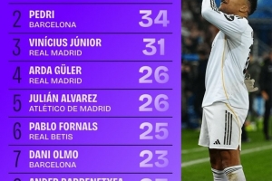 NBA直播12月17日讯 西甲运动战创造机会排行榜出炉,姆巴佩47次高居第一,佩德里、维尼修斯紧随其后。