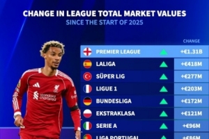 NBA直播10月25日讯 德国转会市场统计了欧洲各联赛2025年球员总身价的变化,并列出榜单,英超增加13.1亿欧最多,西甲增加4.18亿欧次席。