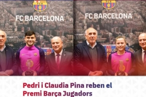 NBA直播12月18日讯 巴萨佩德里和克劳迪娅·皮娜获得了巴塞罗那球员奖,这是俱乐部球员协会每年颁发的奖项,旨在表彰球员在该赛季展现出的公平竞赛精神。协会主席胡安·曼努埃尔·阿森西和俱乐部董事何塞普·伊格纳西·马西亚在体育城举行的仪式上负责向球员颁奖。