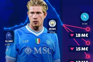 NBA直播12月19日讯 德国转会市场预热德布劳内最新身价,这位34岁的比利时中场身价确定下降。