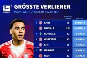 NBA直播12月19日讯 德国转会市场列出了德甲身价下跌榜,凯恩、穆西亚拉身价下降1000万欧居首。