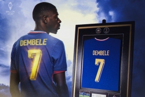 NBA直播12月20日讯 据法国足协官方在线商店显示,为庆祝登贝莱荣获2025年金球奖,官方推出了一款极其珍贵的联名收藏品,带有独家金色印字的登贝莱装裱球衣。