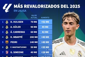 NBA直播12月24日讯 德国转会市场列出了2025年西甲球员身价上涨排名,赫伊森上涨5200万欧居首,居莱尔上涨4500万欧次席。