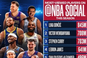 NBA直播12月24日讯 今天,NBA官方晒出了本赛季NBA社交媒体平台上观看次数最多的10位球员,其中9位将在圣诞节当天亮相,详情如下: