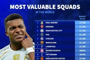 NBA直播12月25日讯 德转更新各联赛球员身价,并列出了俱乐部身价排名,皇马13.8亿欧居首,阿森纳、曼城前三。