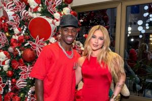 NBA直播12月25日讯 今天是西方传统节日圣诞节,维尼修斯的女友弗吉尼亚晒出了两人在圣诞树前的合照,并向粉丝球迷送出圣诞祝福,维尼修斯本人也转发了合照。
