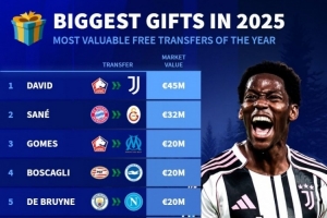 NBA直播12月26日讯 德国转会市场统计了2025年自由身转会球员的身价,并列出榜单,戴维4500万欧居首。