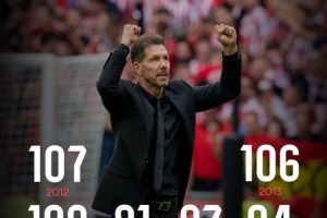 NBA直播12月26日讯 西甲官方晒出西蒙尼执教以来马竞历年的进球数量,并列出榜单,今年打进112球最多。