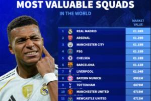 NBA直播12月26日讯 2025年接近尾声,德转列出了全球球队身价排名前二十,皇马以13.8亿欧排名第一,阿森纳12.9亿欧第二,曼城、巴黎分列第三、第四。