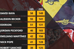 NBA直播12月26日讯 据Opta统计,拉亚已出战149场英超比赛,接近达成150场里程碑。拉亚英超首秀以来联赛零封58场,英超门将同期最多。