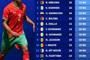 NBA直播12月27日讯 德转列出了本届非洲杯球员身价排行榜,阿什拉夫位列第一。