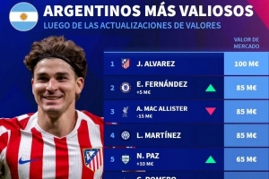 NBA直播12月27日讯 德国转会市场更新了各大联赛球员的身价,并列出阿根廷球员身价排名,阿尔瓦雷斯1亿欧居首。
