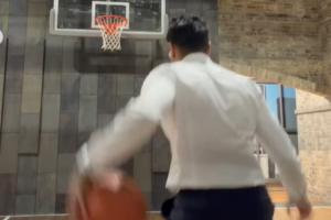 NBA直播10月26日讯 今日,ESPN名记Shams晒出自己在连续工作14个小时之后西装革履运球&投篮的视频。