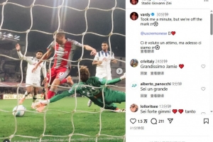 NBA直播10月26日讯 瓦尔迪今天在Instagram发文,庆祝自己打入克雷莫内塞生涯首球。