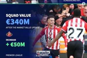 NBA直播10月27日讯 《转会市场》在近日已经更新了五大联赛球队身价,他们也据此列出了各大联赛最新身价更新后的身价(欧元)上涨和下降最多的球队。