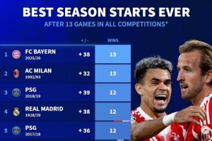 NBA直播10月27日讯 拜仁在本轮德甲焦点战3-0完胜门兴,延续了赛季开局全胜战绩,也追平米兰的五大联赛球队单赛季各项赛事开局连胜纪录。《转会市场》也统计了五大联赛球队历史的单赛季各项赛事前13场比赛的胜场情况。