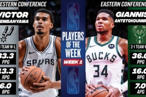 NBA直播10月28日讯 NBA官方宣布,字母哥和文班亚马分别当选了东西部第一周的周最佳球员。