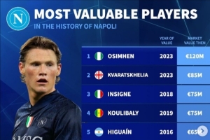 NBA直播10月28日讯 德国转会市场统计了那不勒斯队史的身价前10球员,奥斯梅恩位列第一。