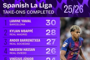 NBA直播10月29日讯 Squawka统计了本赛季球员在西甲的成功过人次数,并列出榜单,亚马尔、姆巴佩排名前两位。